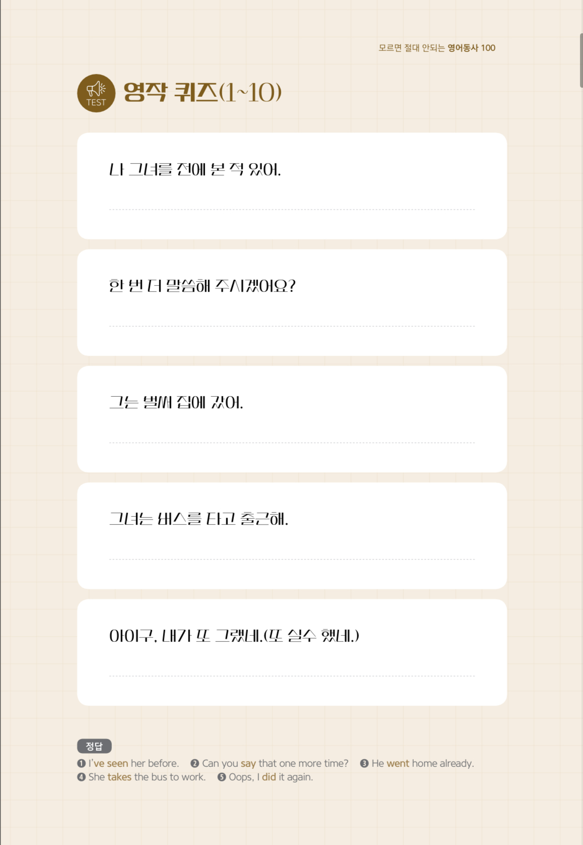 - 📝 퀴즈 페이지 → 배운 동사, 내가 얼마나 익혔는지 확인!